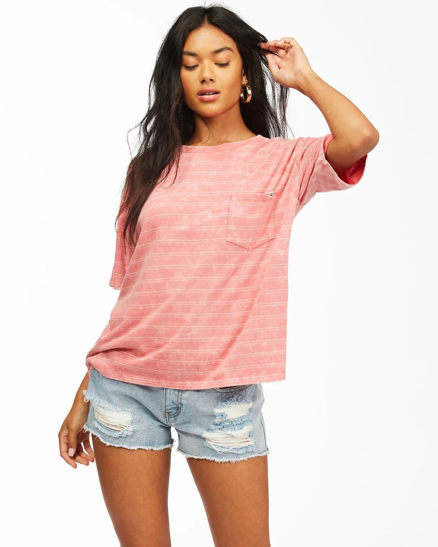 The Billabong Beach Stripes Tee for women delivers unstructured lines for laid-back days. A women’s t-shirt with a slightly oversized fit takes on a vintage feel with allover stripes finished with a worn-in mineral wash. Soft and unstructured thanks to a loose knit jersey, the women’s pocket tee is topped with a small logo at the pocket hem.