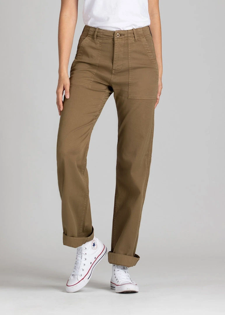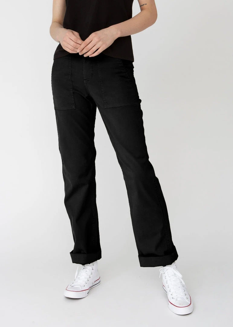 Hugs at the waist, fitting looser throughout the hip and leg, this style features deep front patch pockets, buttoned back pockets, and a wide leg opening.