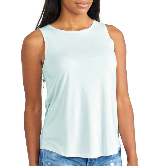 A new tank featuring solid and striped colors. Flattering high neck and flowy drape makes it versatile for performance or play.