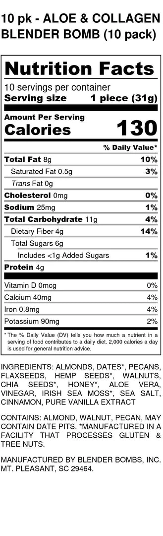 - Ingredients: Almonds, Organic Dates, Pecans, Ground Flaxseed, Organic Hemp Seed, Walnuts, Organic Chia Seeds, Raw Honey, Aloe Vera, Organic Bee Pollen, Organic Irish Sea Moss, Sea Salt, Cinnamon, and Pure Vanilla Extract
