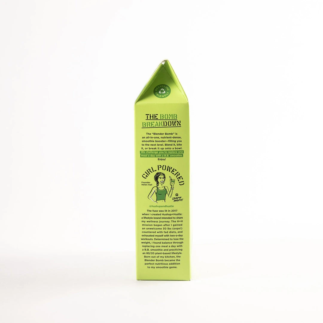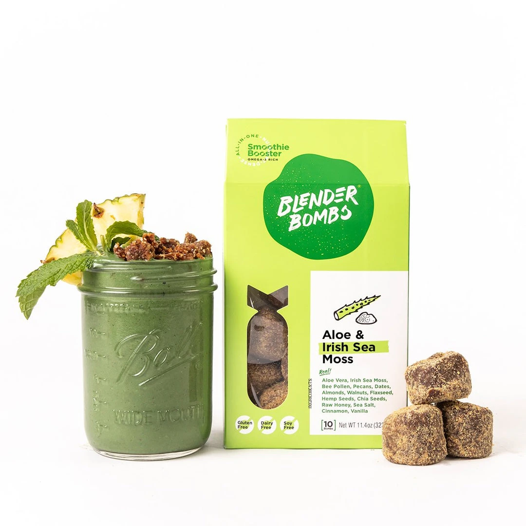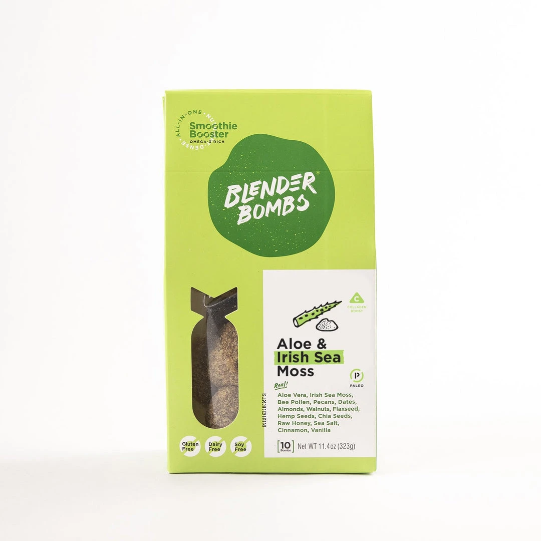 Formerly known and loved as the Aloe & Collagen bomb, we’ve given this plant-based ball of goodness a little extra ka-pow by adding Irish Sea Moss. Before you get scared away by ‘sea moss’ – you should know, as a collagen synthesizer, it promotes youthful skin, healthy hair, and stronger nails.Sea Moss? Yes please, may I have another.The aloe ingredient contributes to healthy digestion and with this bomb’s neutral flavor profile, it is the perfect addition to any smoothie. The combination of nuts, seeds, a date, and a little organic raw honey in a Blender Bomb, mixed in with the fruit in your smoothie, prevents your blood sugar from skyrocketing. The BB helps battle that mid-morning slump and temptation to snack. Even better – they are a simple solution to assist with weight loss and weight maintenance, all while ensuring you’re getting your daily dose of plant-based nutrition!