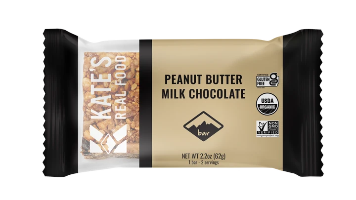 These Peanut Butter Milk Chocolate Bars pack in 3 grams of protein per serving to help fuel your outdoor adventures or busy day. All of Kate’s Real Food products are made with certified gluten-free oats, making them a good choice for those with gluten allergies or intolerances.