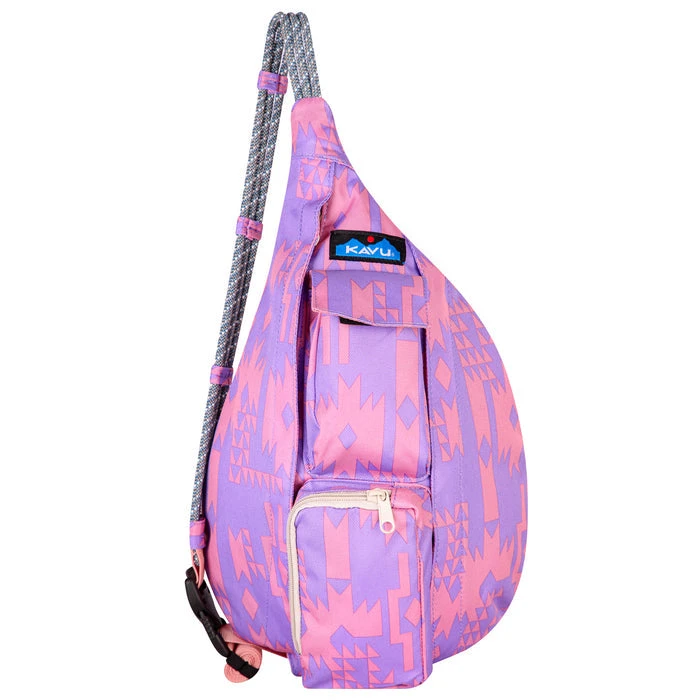 Mini sling pack with adjustable rope shoulder strap, two vertical zip compartments, two key or cell phone pockets, padded back with KAVU embroidery. Unisex.