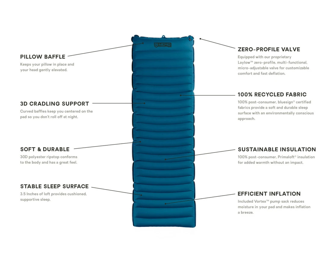 Newly added to the collection, this rising star utilizes our body-mapped 3D baffling to gently cradle and keep you centered on the pad during the night. The slightly elevated head baffle serves as a headboard, helping to keep your camp pillow in place. Packable, durable, and weight conscious, Quasar™ is a great versatile option for any adventure. Quasar™ 3D makes a leap forward in sustainability with our first ever bluesign® Certified sleeping pad. The durable 30D polyester ripstop is made of 100% post-consumer recycled materials that conform to the body and have a great feel. Our custom Laylow™ zero-profile, multi-functional valves, combined with our included Vortex™ pump sack, allow you to inflate and deflate quickly and easily make micro adjustments for maximum comfort.