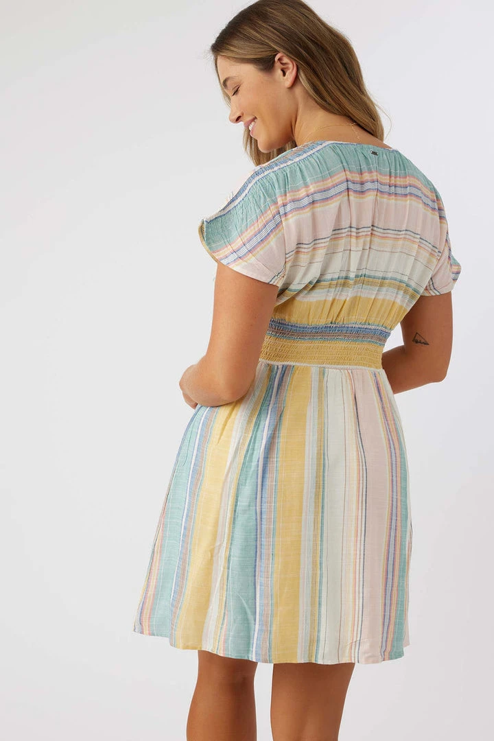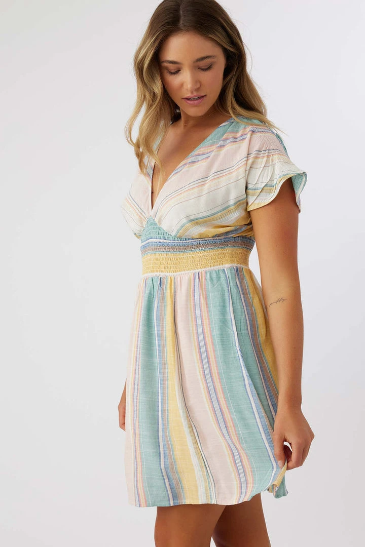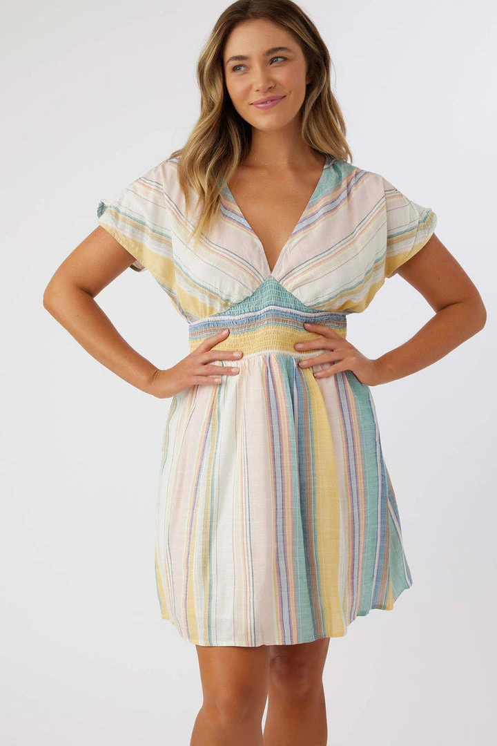 Sweet and stylish woven mini dress that has a yarn dye stripe design, deep v-neckline and allover print.
