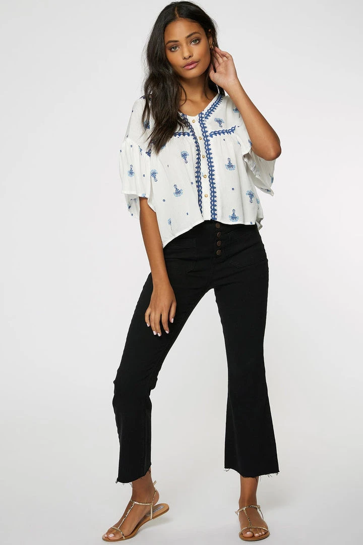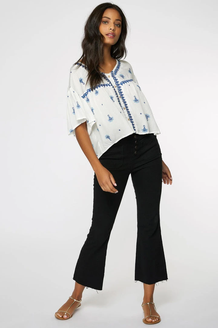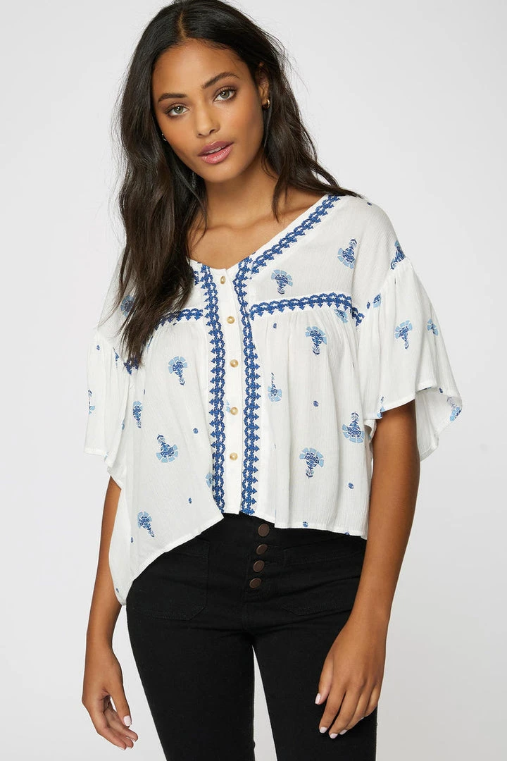 Cute top. This casual woven has a relaxed style fit, v-neckline and inset border print details.