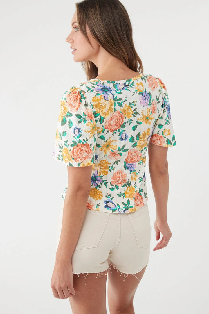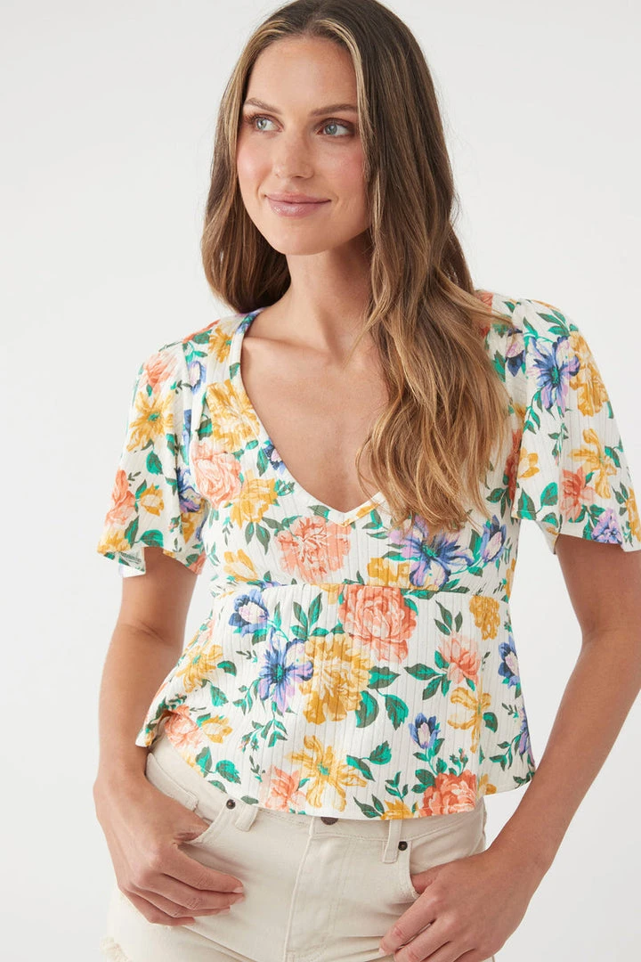 Cute and casual knit top that features a skimmer length fit, deep v-neckline and vibrant floral print.