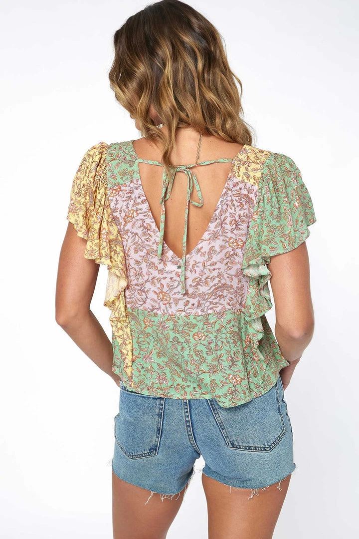 An easy-going woven top that has a ruffle hem detail, allover print and flowy fit.