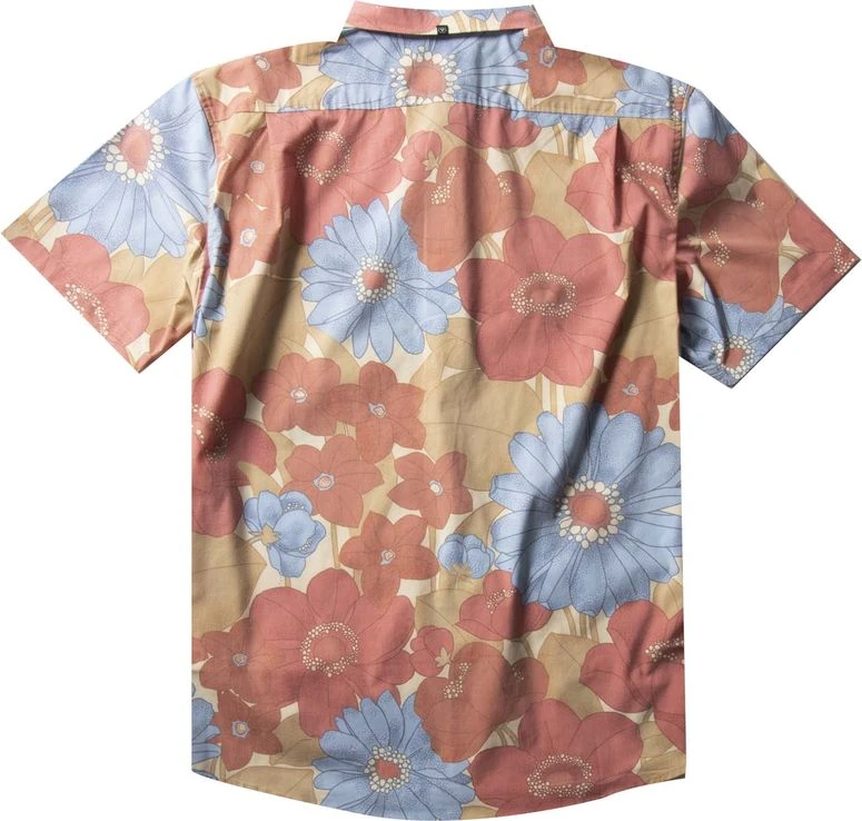 Bright, blooming floral-print eco shirt. The Lopa woven is lightweight, loud and lovely, made with a sustainable blend of recycled polyester repreve, cotton, and spandex. Styling includes a fold over center front placket, button down front chest pocket and contrast chambray lining at inside back yoke. Garment washed with softener + enzyme.
